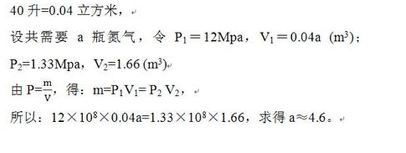 2、壓力容器容積1.66立方米,氣密試驗(yàn)壓力1.33Mpa ; 瓶裝氮?dú)鈮毫?2Mpa,體積40升;共需要多少瓶氮?dú)猓?